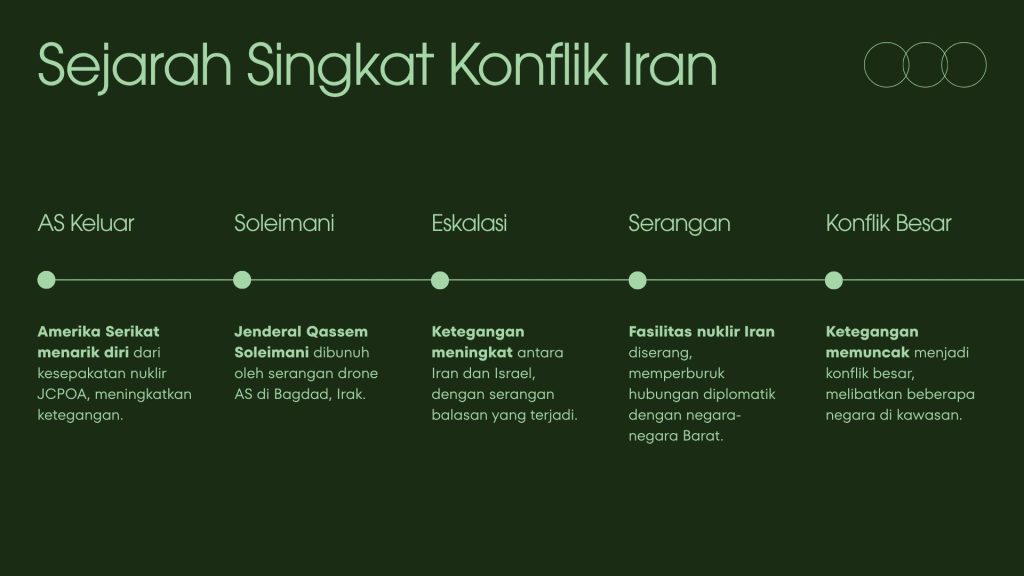 Dalam paparannya, Ustadz Pizaro menyajikan timeline konflik AS-Iran secara kronologis: